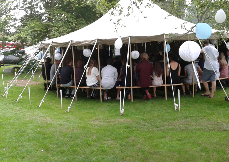 Je kunt kiezen uit een tent met 6 meter doorsnee voor een feest met maximaal 30 personen of een tent met een doorsnee van 8 meter voor maximaal 50 personen.Vraag naar een feest op maat. We leveren meubilair, fraaie aankleding, verlichting, keuken, enz.